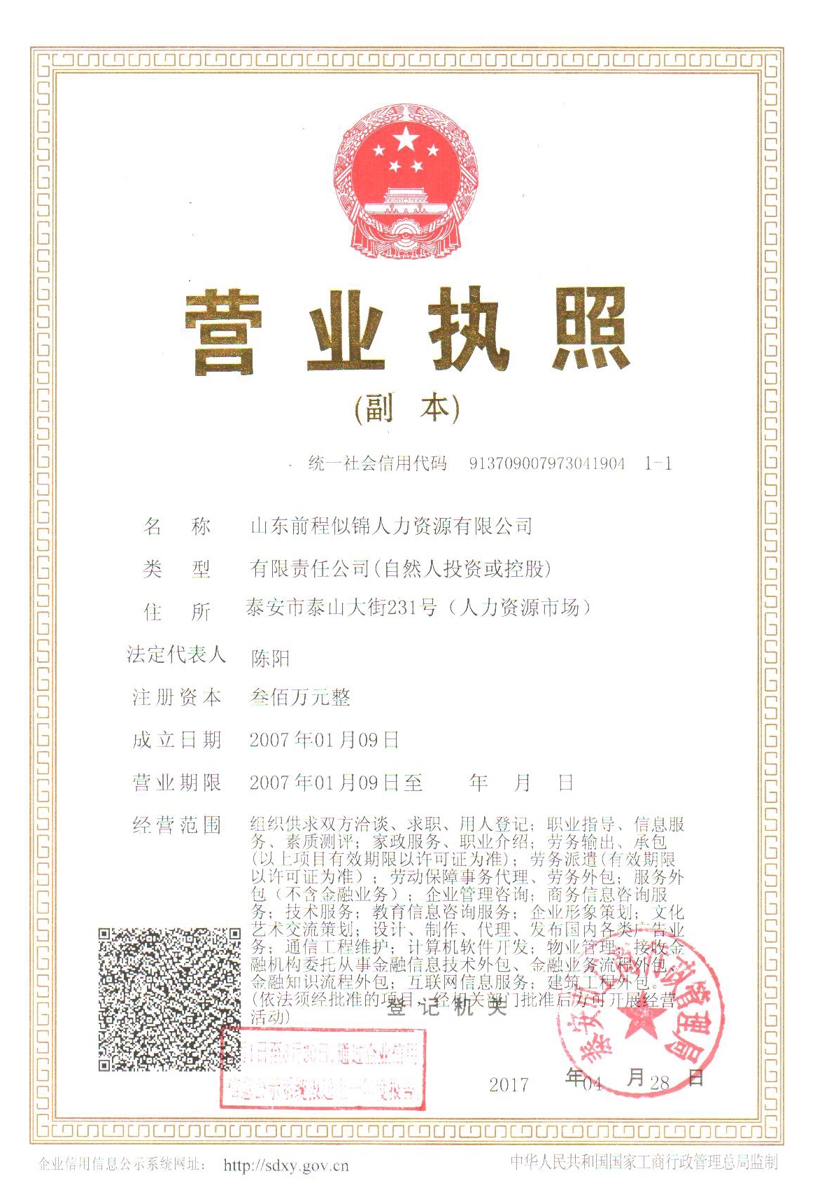 山東前程似錦人力資源有限公司成立于2007年1月,注冊資本1000萬元,公司注冊地為泰安市風(fēng)景名勝區(qū),目前已在濟(jì)南市等16個(gè)地市設(shè)有分公司(辦事處),在北京、上海、天津等地設(shè)有駐在機(jī)構(gòu)。